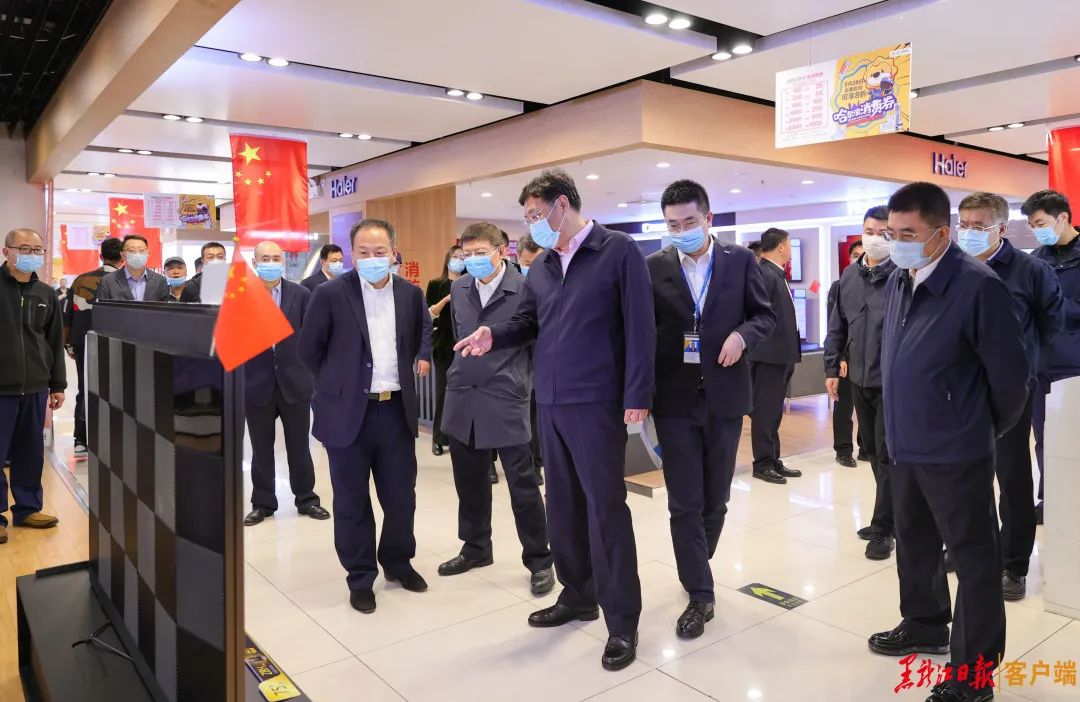 为刺激黄金周消费快速回升,近日省级财政追加了哈尔滨市消费券补助支持财力,一系列利好政策有效激发了市民消费热情,节日期间的中央大街人头攒动,各大市场供需两旺。在苏宁易购中央大街店,王文涛向商家了解消费券使用情况,商家反映政府发放消费券助企惠民,对消费市场回暖发挥了积极作用。王文涛来到5G手机体验区和手机以旧换新自助服务区,与购物的消费者交流,了解商家开展以旧换新促销活动。王文涛还观看了苏宁易购智能VR购物场景演示,对借助互联网、大数据、人工智能技术,发展新业态新模式给予肯定。
